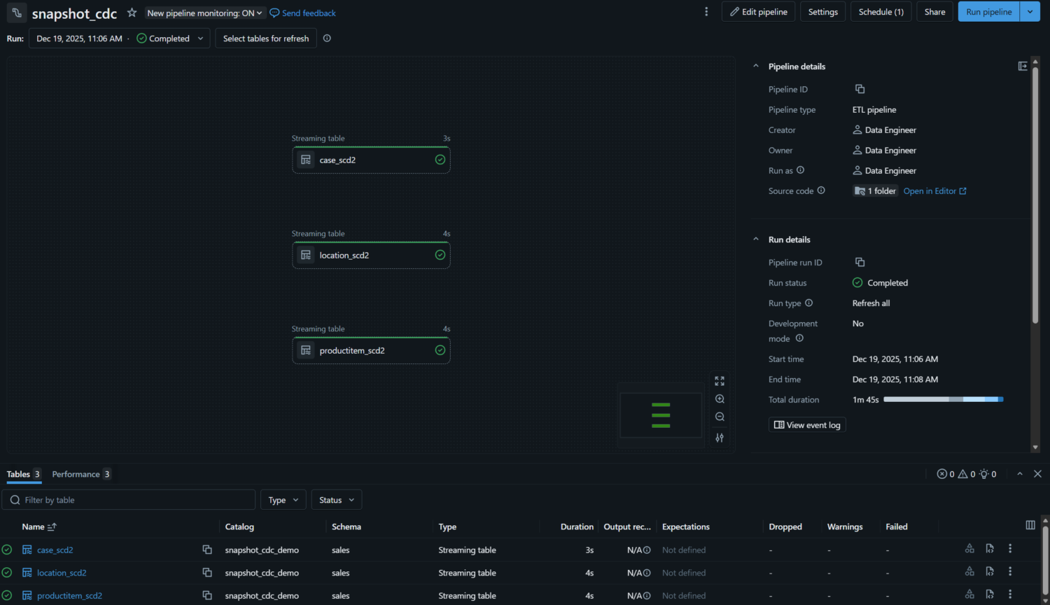 Once deployed in Databricks, the pipeline can be run manually or scheduled. In production, it typically runs daily when new snapshots arrive, or continuously to automatically pick up new snapshots as they become available.