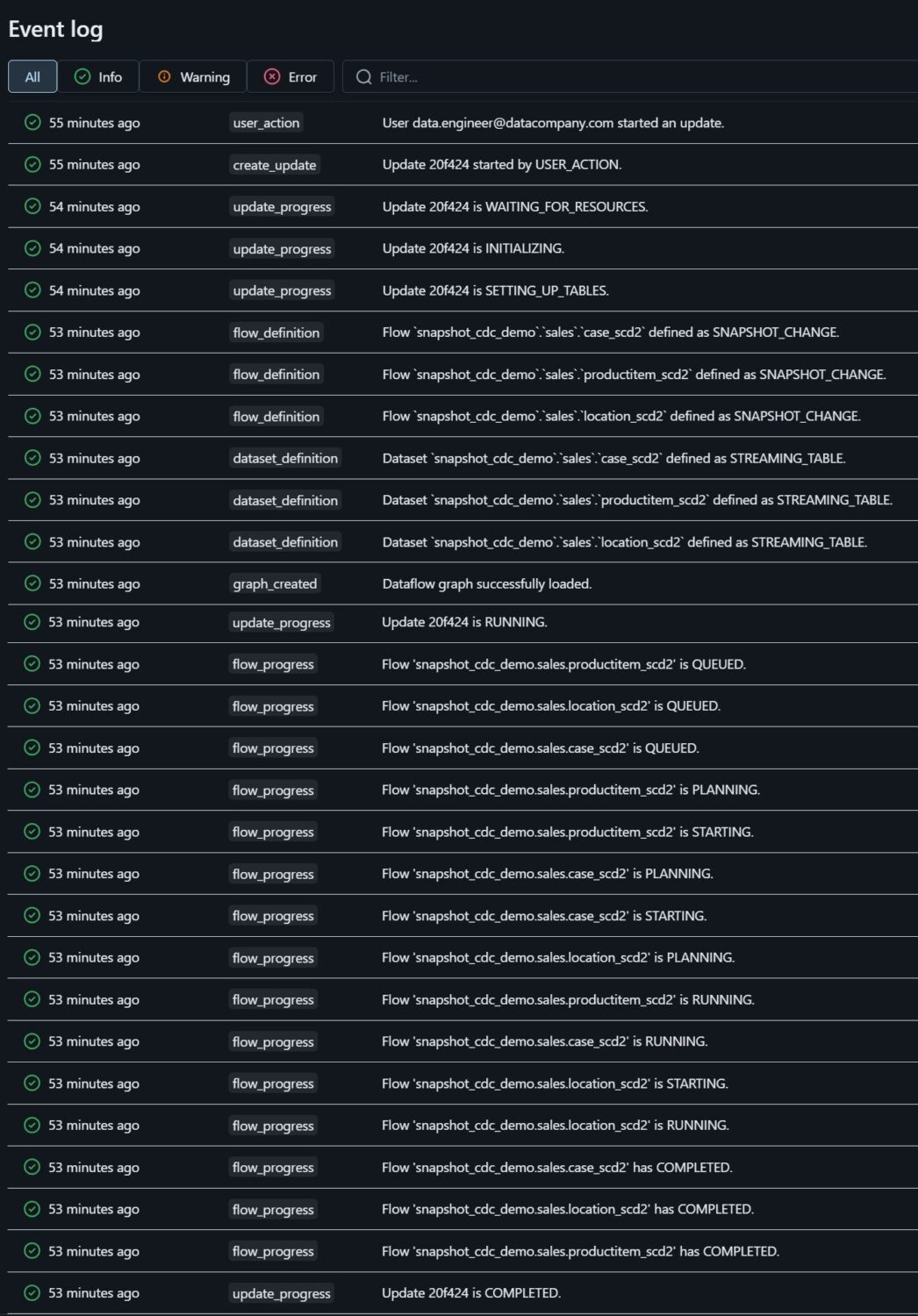 The pipeline monitoring page offers a clear overview of each run. Each table appears as a node in the DAG or as a row in list view, showing status, duration, and any errors at a glance. However, row-level metrics are not captured for AUTO CDC FROM SNAPSHOT flows, those are only available for AUTO CDC queries with change data feed enabled source data.